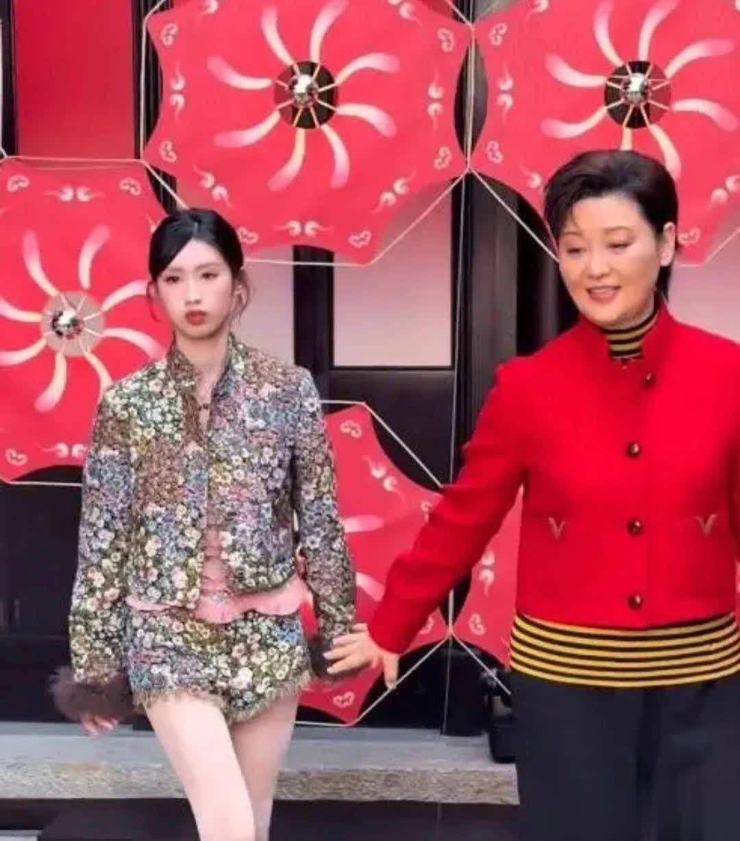 而女儿徐朵则穿着,类似花朵刺绣的套装。